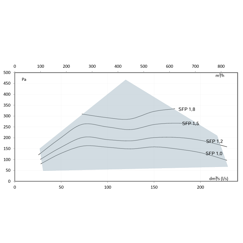- 800 m³/h oro srautas ir 200 Pa slėgis.