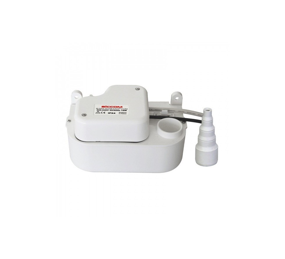Kondensato siurbliukas SUNNY FLOWATCH® CLIM 15l/h, 10m – SICCOM gamintojo produktas, mini bako siurblys (solenoidas), skirtas oro kondicionierių kondensato pašalinimui iki 10 kW. Savybės: Itin tylus siurblys, tinkamas montuoti bet kurioje patalpoje. Lengvai nuimamas ir valomas. IPX4 apsauga nuo vandens purslų Lengvas pritvirtinimas prie sienos