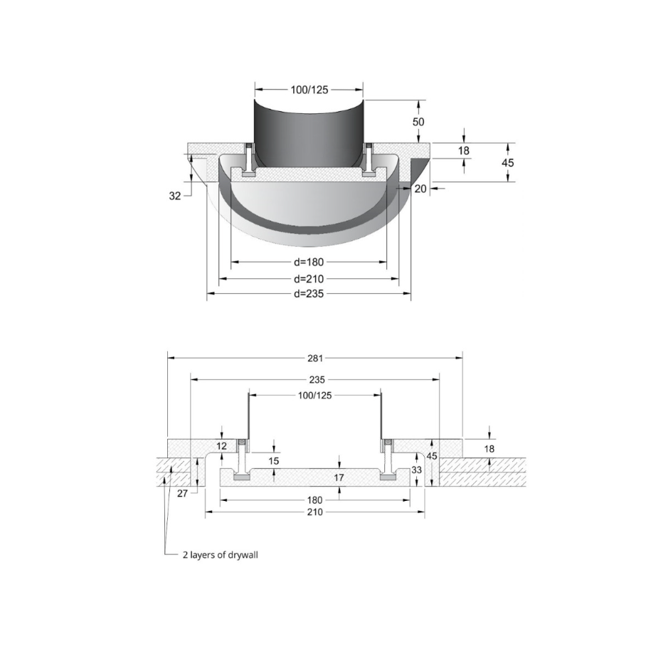 - Pajungimas 125 mm, su metaliniais tvirtinimo sparneliais.